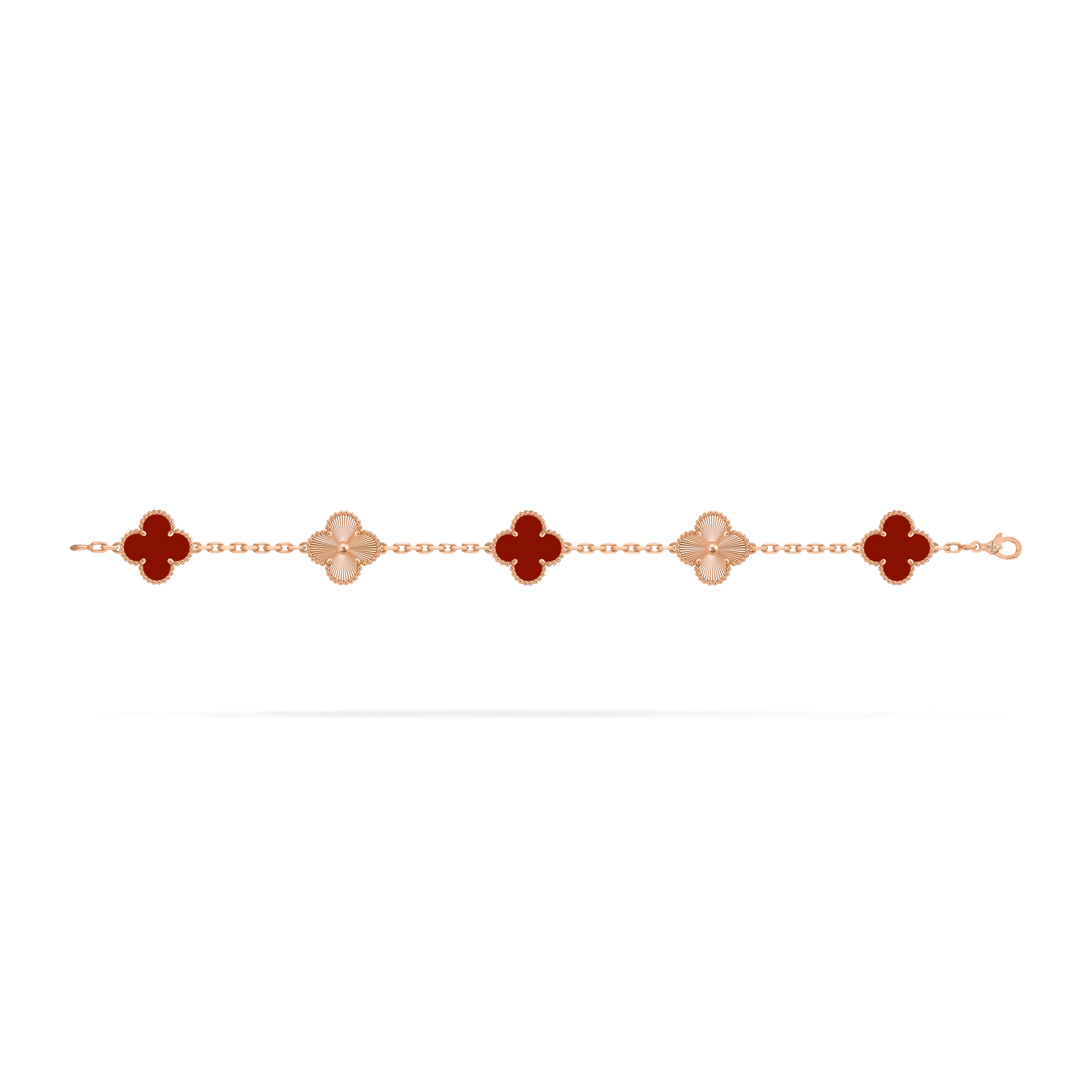 Van Cleef & Arpels’ Vintage Alhambra Bracelet is a gorgeous piece of jewelry that radiates sophistication and elegance. This imitation bracelet has five famous Alhambra motifs, each with a delicate mother-of-pearl inlay, and is made with premium materials and painstaking attention to detail. The 18k yellow gold setting highlights Van Cleef & Arpels’ renowned craftsmanship and adds a hint of elegance. It is a classic and adaptable addition to any jewellery collection because the chain can be adjusted to fit perfectly on every wrist. This vintage alhambra bracelet will add flair to any ensemble, whether it is worn alone or layered with other items.