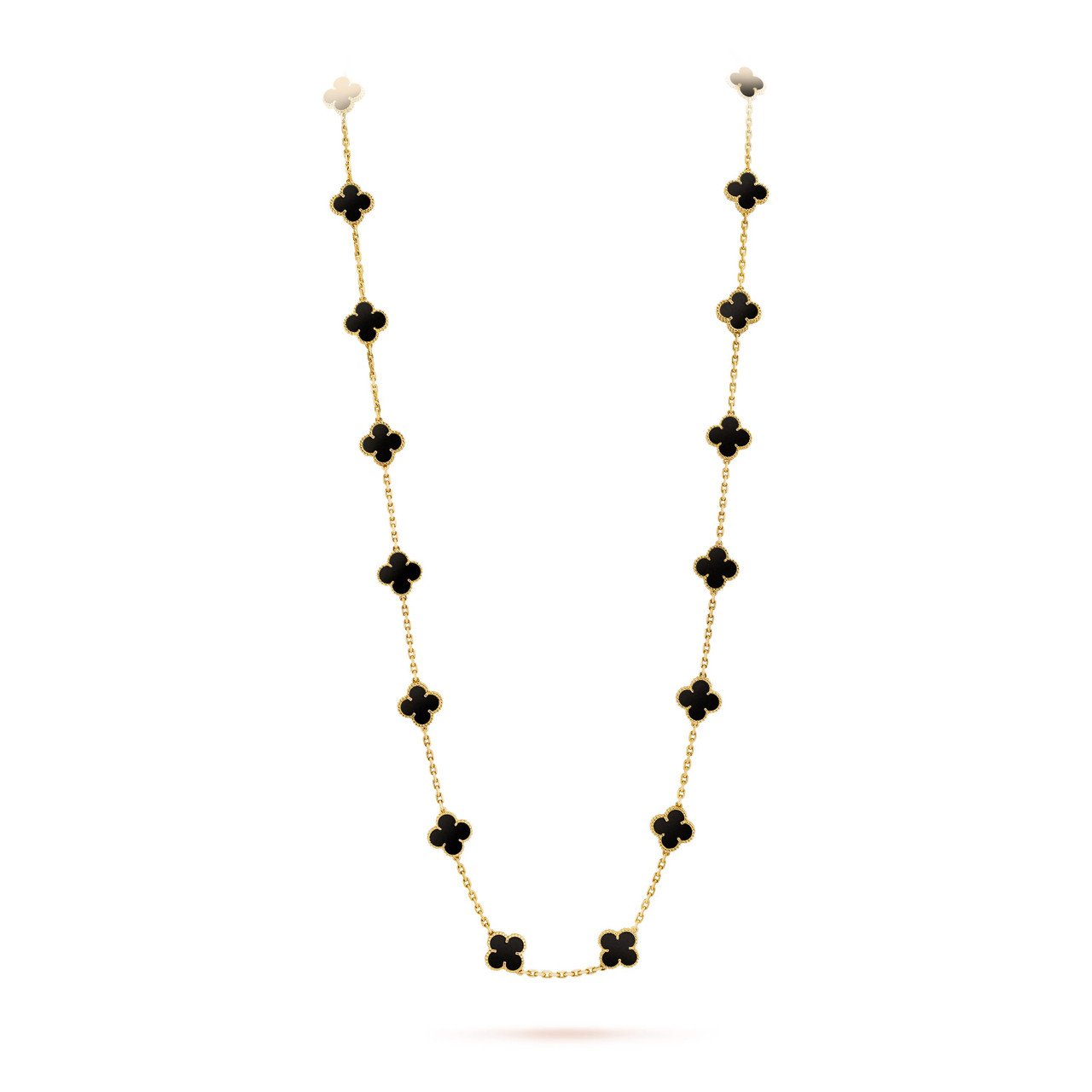 This gorgeous 20-motif long necklace inspired by Van Cleef & Arpels is an elegant and luxurious accessory. Made with premium-grade materials and fine craftsmanship, it showcases the signature Alhambra style with 20 motifs that radiate class and refinement. Its distinctive vintage appeal adds charm and nostalgic beauty to any look. Please keep in mind that this piece is a replica, not an authentic Van Cleef & Arpels product. Although it is not an exact original, the necklace reflects the spirit of the iconic design and provides a more budget-friendly option for those who admire this timeless classic.